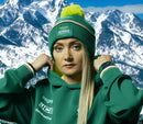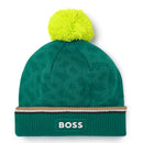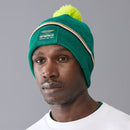 A new Racing Green beanie skull cap for 2024 designed in conjunction with BOSS. Made with soft and warm knit acrylic with an iconic fluffy two tone Fluro and Green pom pom. This comfy toque turn up hem with stripe details.