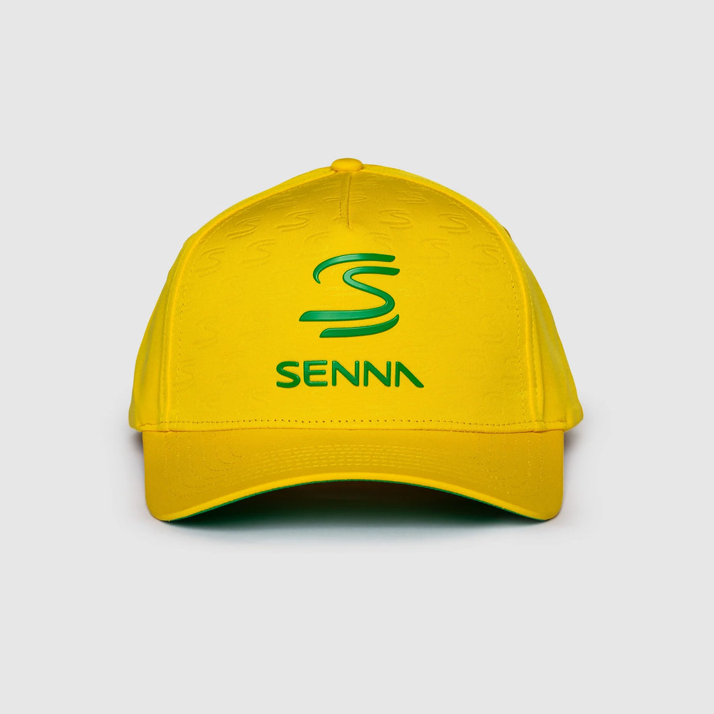 An iconic cap, in the Green and Yellow of Brazil with Sennas logo on the front and embossed logos on the panels. This new cap is all things F1, respect to Ayrton's legacy, heritage and the Brazilian GP.