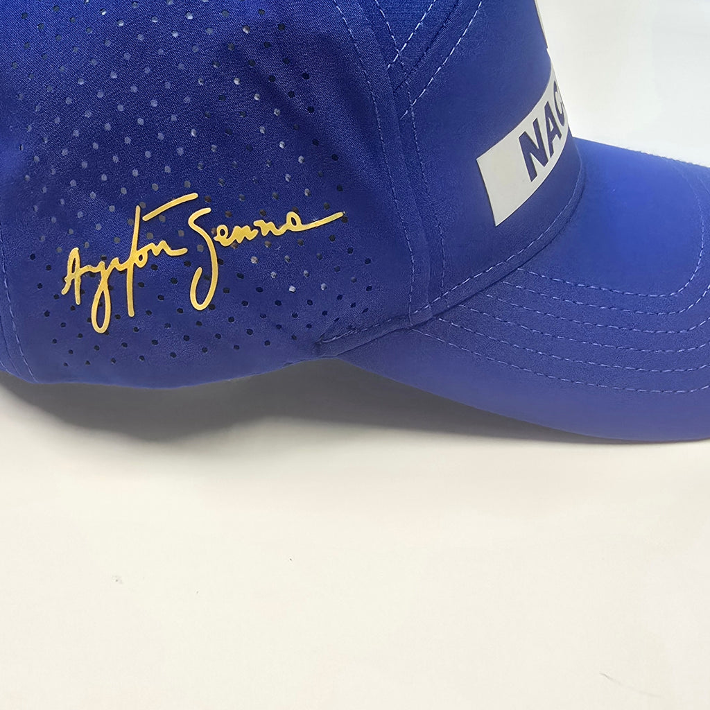 An iconic cap, worn for a decade by Ayrton almost daily in the Nacional Blue. Senna's signature on both sides under permission and license from the family make this a piece of respectful F1 heritage.